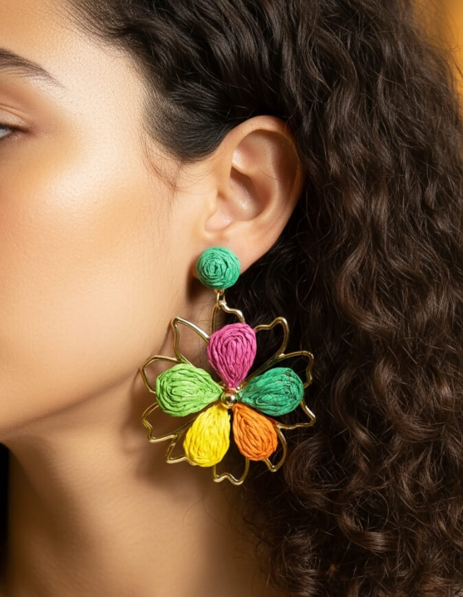 - Design Floral Sculptural : Chaque pétale est méticuleusement gainé de fibre de jute tressée, enserré dans une monture dorée qui souligne sa forme délicate.
