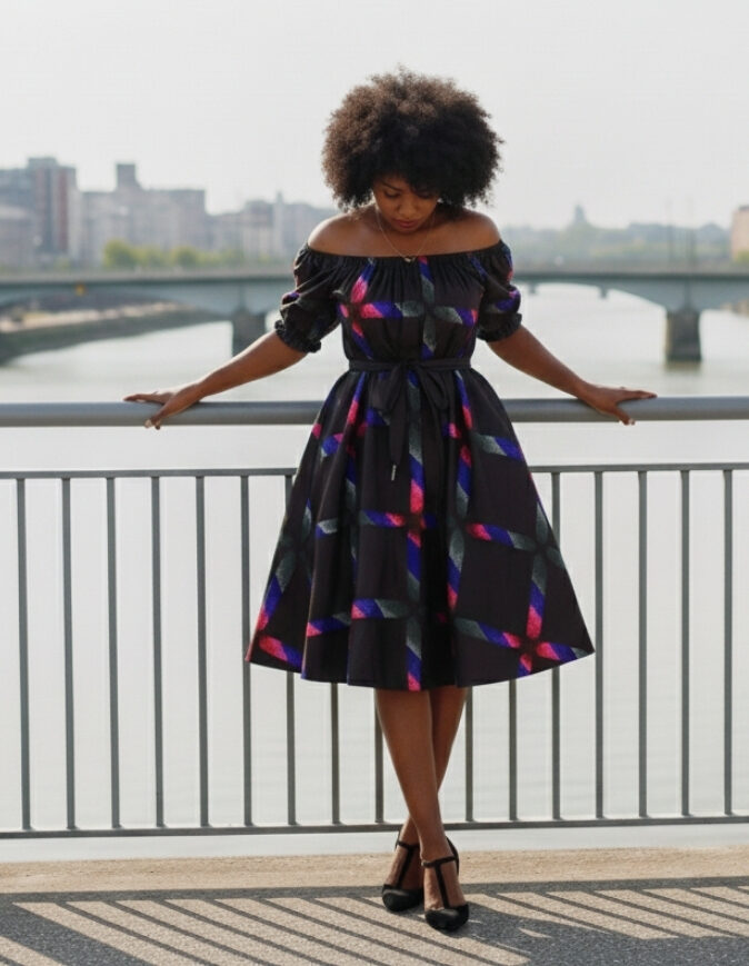 Très Jolie robe été évasée bazin imprimée ethniques africains mi-longue taille genoux. Manches bretelles, évasée, ce qui permet une meilleure aisance et la possibilité d’enfiler la robe quelque soit la taille. Légère et Idéale pour l’été, elle se porte en toute occasion. Peut se porter avec la ceinture (fil dans le même tissu) fournie.