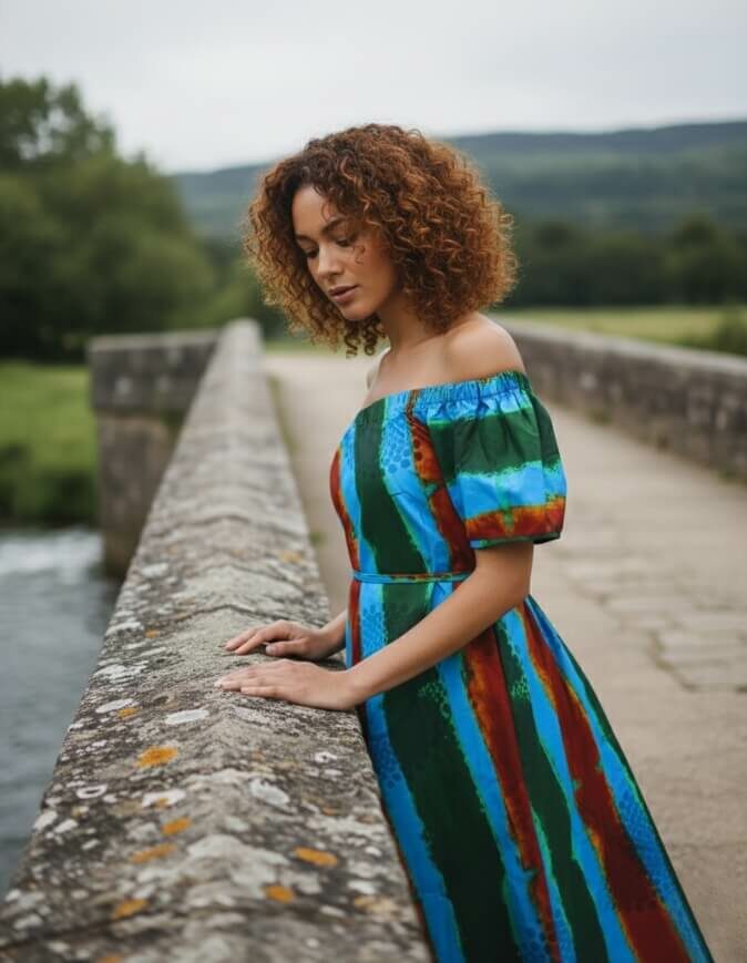 Très Jolie robe Lizie évasée bazin imprimée ethniques africains mi-longue taille Mollets. Manches ballons se porte avec épaules dénudées ou pas, évasée, ce qui permet une meilleure aisance et la possibilité d’enfiler la robe quelque soit la taille. Légère et Idéale pour l’été, elle se porte en toute occasion. Peut se porter avec la ceinture (fil dans le même tissu) fournie. Poches sur les cotés